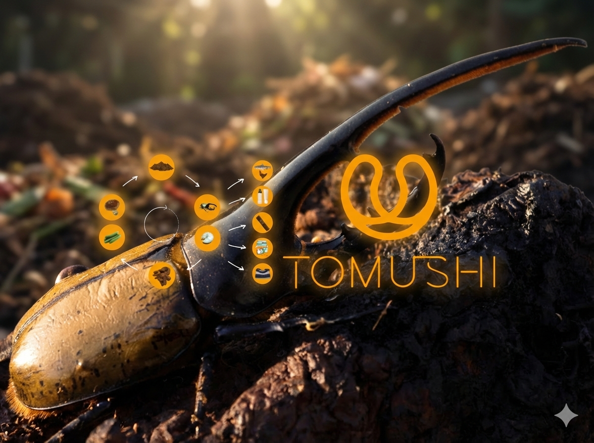 TOMUSHIは、昆虫の力で資源を循環させ、未来を育てるブランドです。捨てられてきた有機資源を昆虫がつなぎ、環境・教育・地域に新しい価値を生み出します。子どもから大人までが楽しみながら命や循環に触れられる体験を通じて、昆虫を「地球のヒーロー」として社会に届けています。